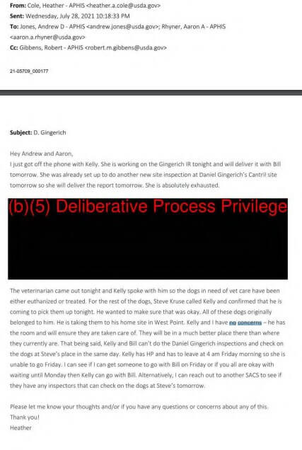 “APHIS officials, a supervisor and the inspector who years before had had the bag of dead puppies thrown at her, said that they had ‘no concerns about letting Kruse take the dogs back,’ despite his history of violations,” Hensley said.