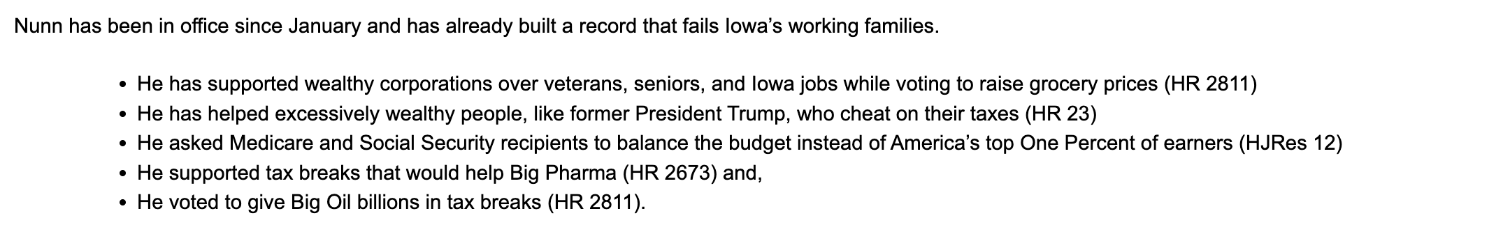 An accompanying press release from Fairness for Iowa cites the specific congressional bills Nunn voted for that they tie to the actions they accuse him of.