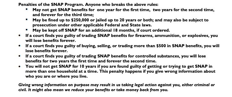 The existing 16-page Iowa SNAP application asks about those specific items. Legal punishments for violating the rules of the program include up to 20 years in jail and up to $250,000 in fines, and there could be additional state and federal charges.