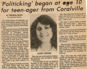 Dick Myers was an early supporter of Jimmy Carter in the 1976 Iowa Caucus. Carter held a campaign event at their house, and Dick became a delegate for Carter at the national convention. The family turned it into a vacation, and Cathy got a guest pass to go on the convention floor for a day.