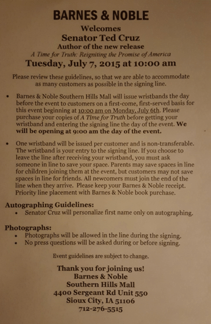 ted cruz instructionsAnd then sometimes the candidate does an event that should get a staffer fired. Ted Cruz recently attended a book signing at the Barnes and Nobles in Sioux City. This book signing required would be attendees to get a wrist-band the day before by going to Barnes and Nobles and buying Cruz’s new book. The wrist-band would then act as an admission ticket the day Cruz arrived. They also handed out instructions to customers. (See attached photo.) The instructions stated that Senator Cruz would only “personalize first name[s]” when signing his book and also prohibited adults from saving line spaces except for children. (Because you know the K-12 set is fanatical about Cruz’s plan to send IRS agents to the border.) Now, if J.K. Rowling published Harry Potter versus the Enchanted Toupee tomorrow, I could appreciate a lot of rules at the subsequent book signings. But Ted Cruz is not J.K. Rowling and his staff should have planned for a rather casual crowd at a mid-day, mid-week, book signing. Regardless of how much ‘awe-shucks’ Texas charm Cruz projects on the stump, the fact that his staff thinks he is too important to sign “To Bob Smith” probably turned off many attendees.