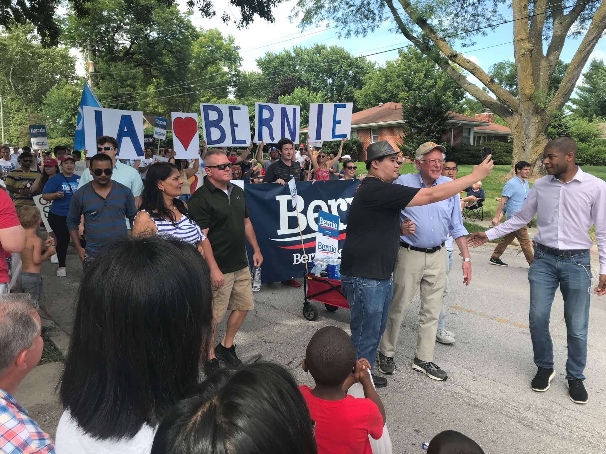 This was the longest route of the day. The Sanders crowd here had a banner of signs reading “IA hearts Bernie.” Because of the long walk, the campaign had a golf cart with them so Sanders could get in quick breaks from the hot, early-afternoon sun.