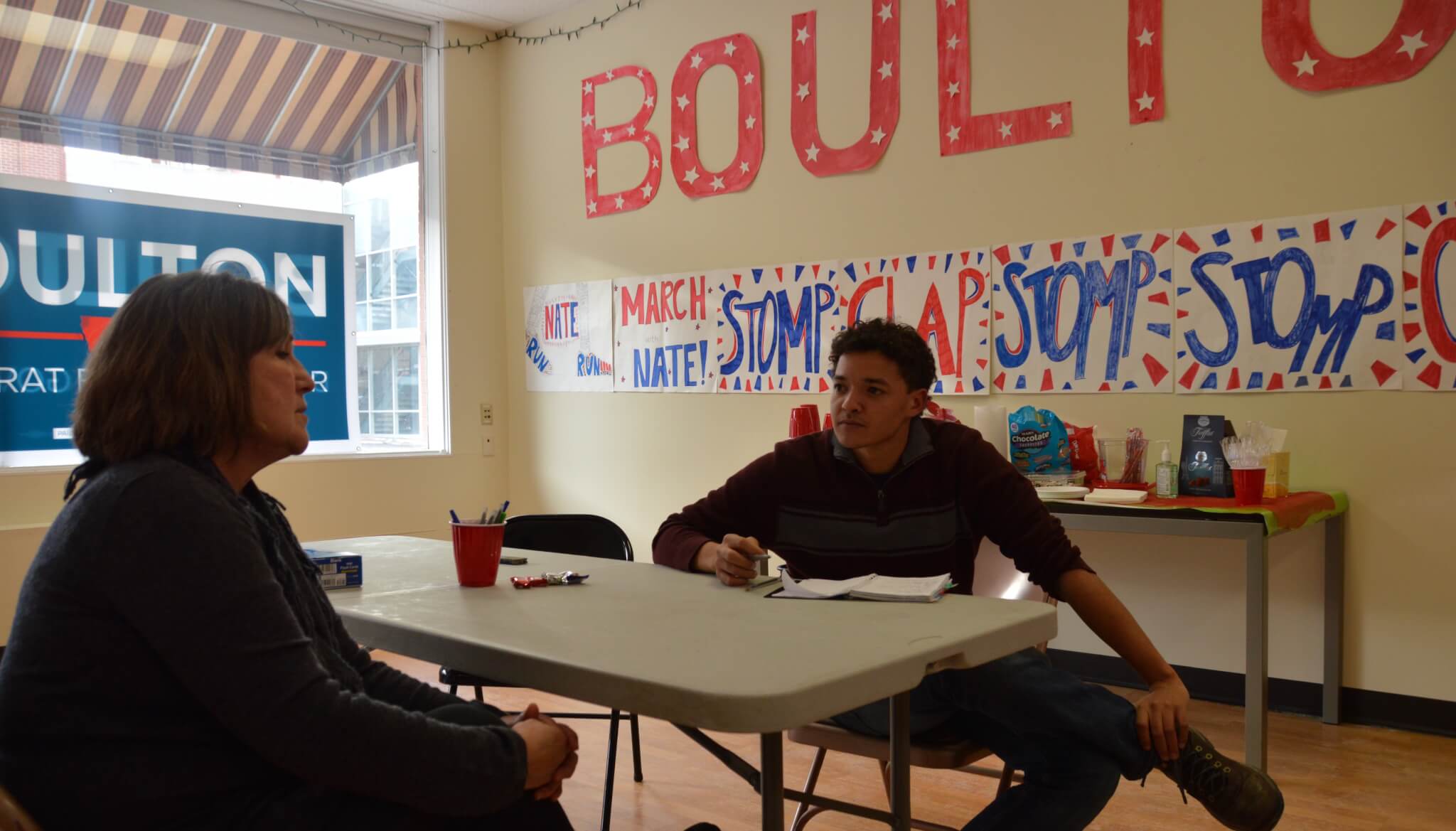That’s what Nate Boulton field organizer Adam Henderson was working on during a recent Friday when Starting Line shadowed him for an afternoon. His first one-on-one meeting of the day was down the street from Boulton’s East Village campaign headquarters at Scenic Route coffee shop, meeting local activist Kim Cornick.