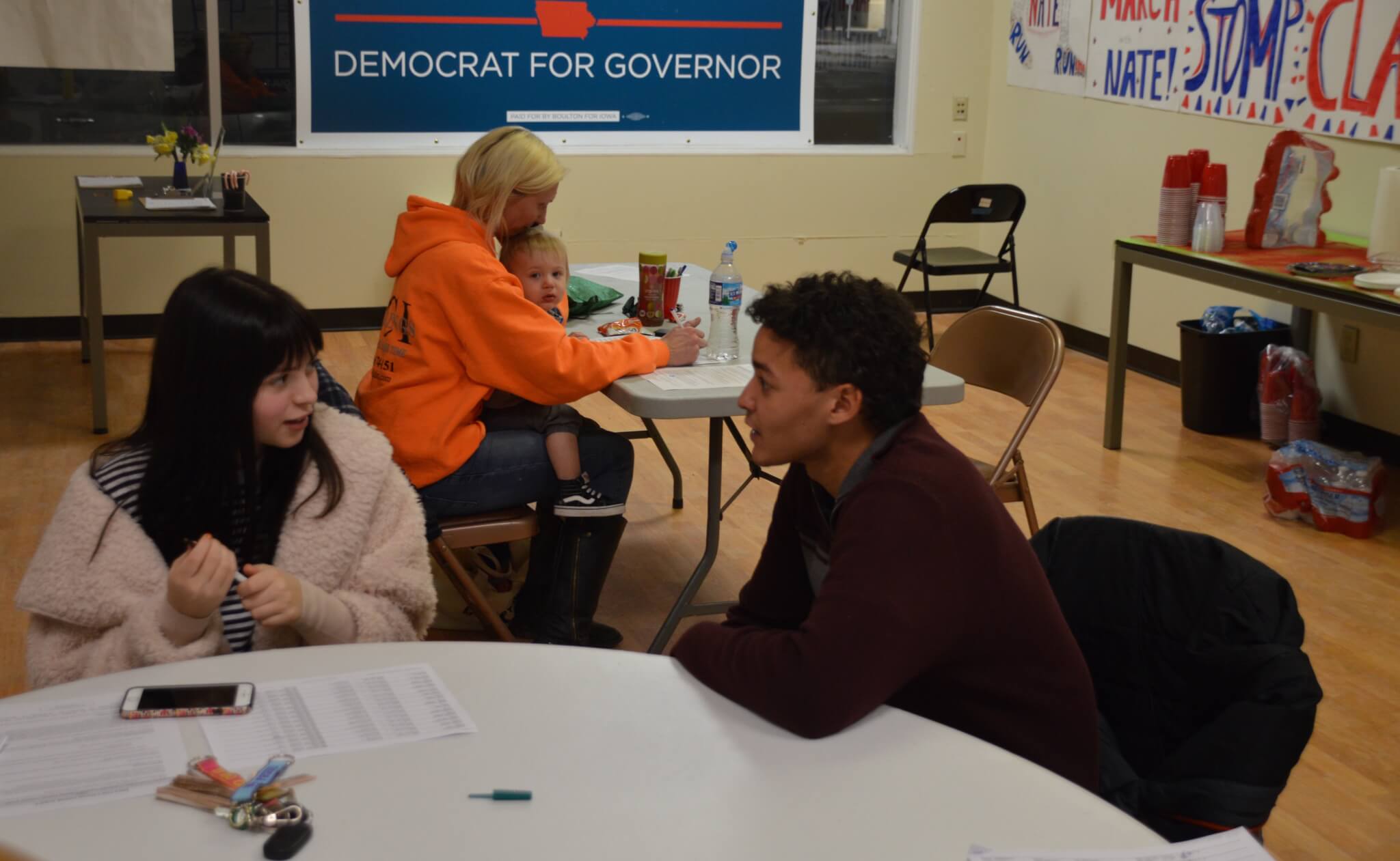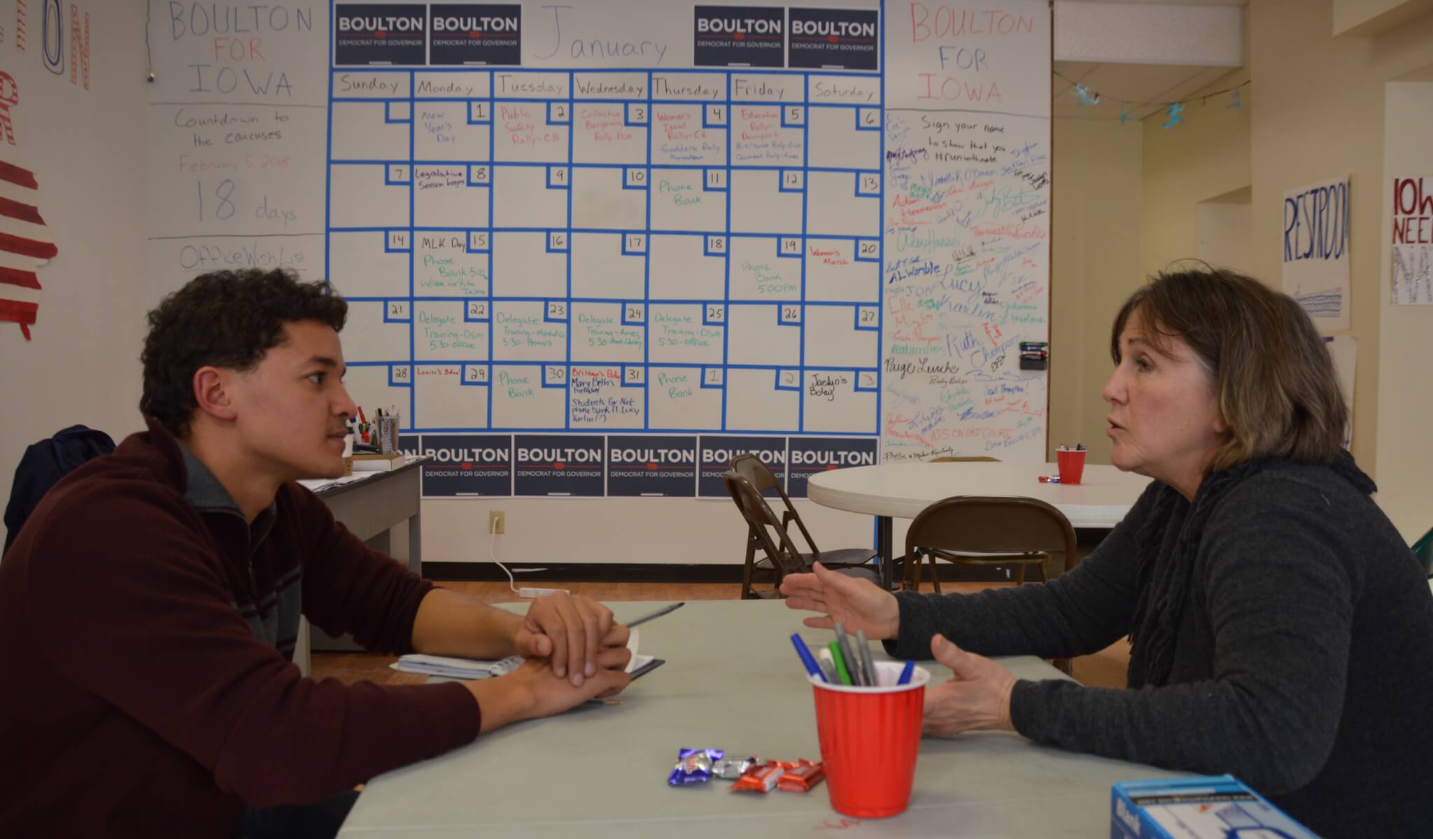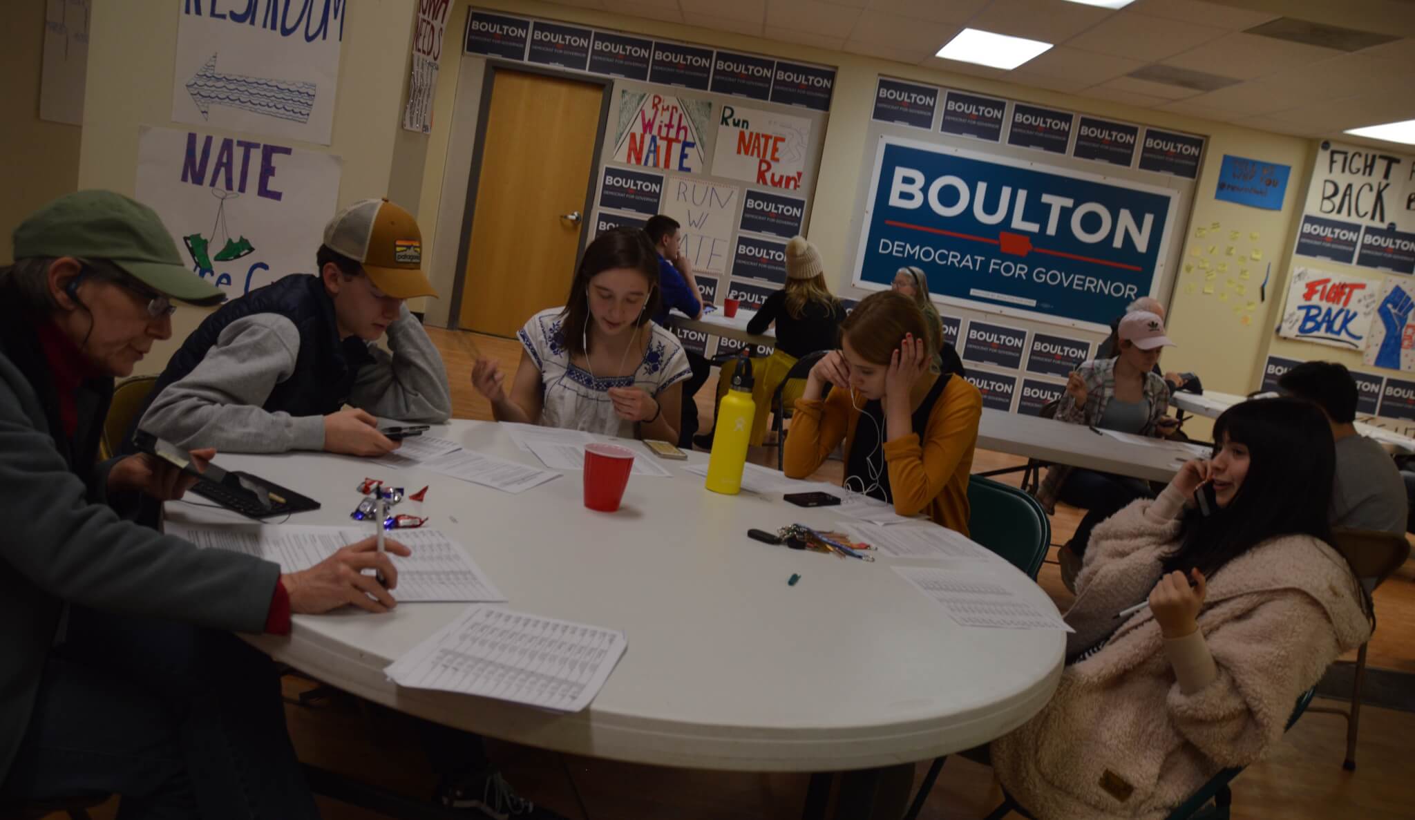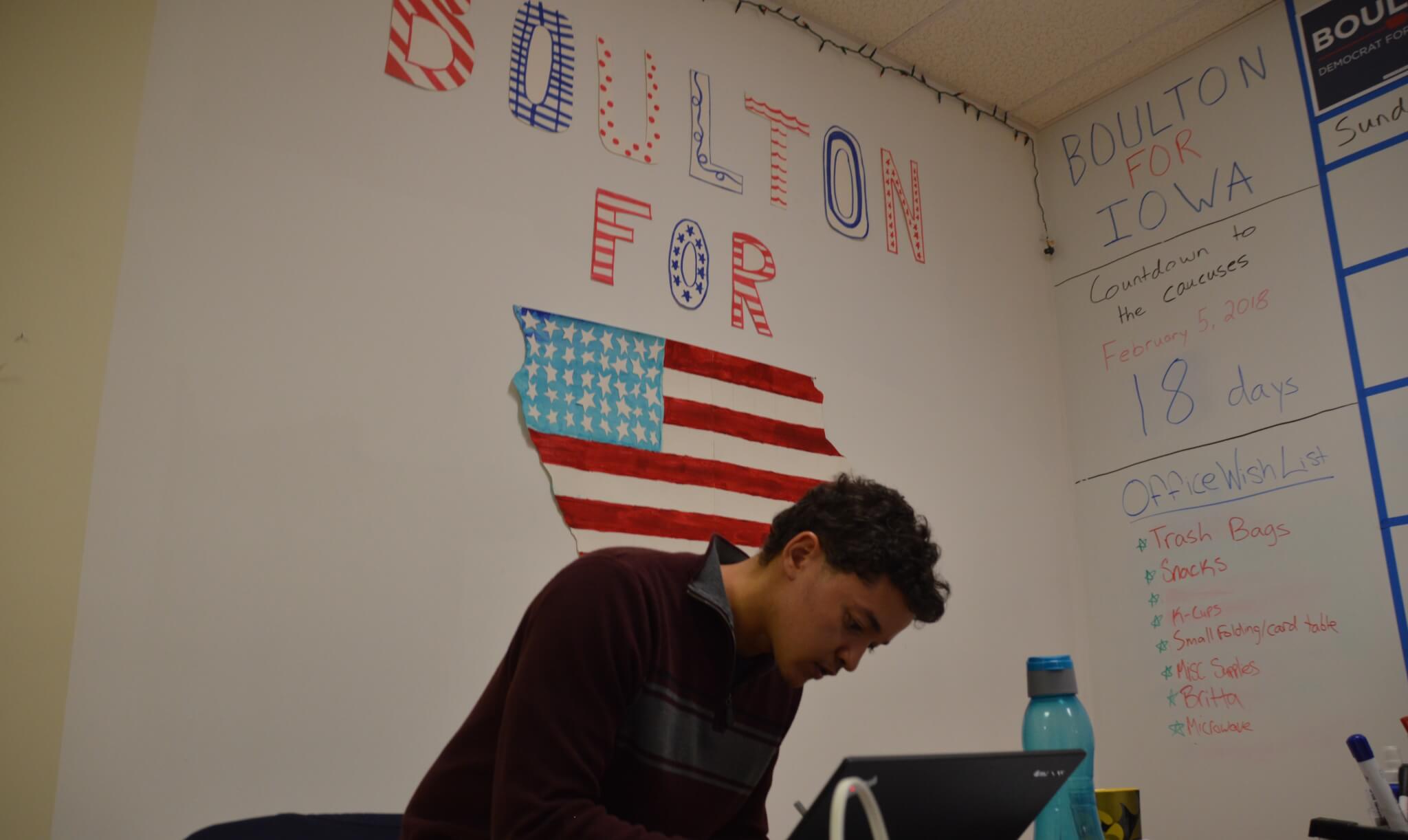 As the volunteers complete their work, finished call sheets start coming back to Henderson’s desk. Eventually it’s just him and Isabella O’Connor, one of the small army of interns that the Boulton campaign has as their disposal. Many of them come from Roosevelt High School and several, including O’Connor, got to know Boulton working as pages in the Iowa Senate last year.