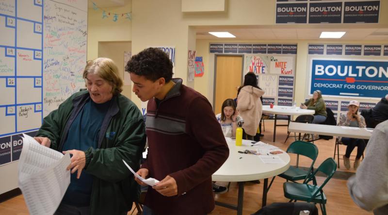 When they get back to the office, Henderson’s crew of phone banking volunteers are starting to arrive. Twenty people in all show up to call and ID voters for the caucus – not a bad turnout for a Friday night. Attendees range in age from 15 to 78 (there was also a two-year-old, but he wasn’t making calls). Everyone says they’ve seen Boulton’s latest TV ad, which also helps the calls go easier.