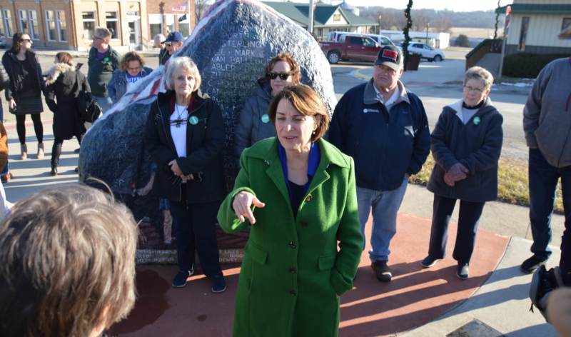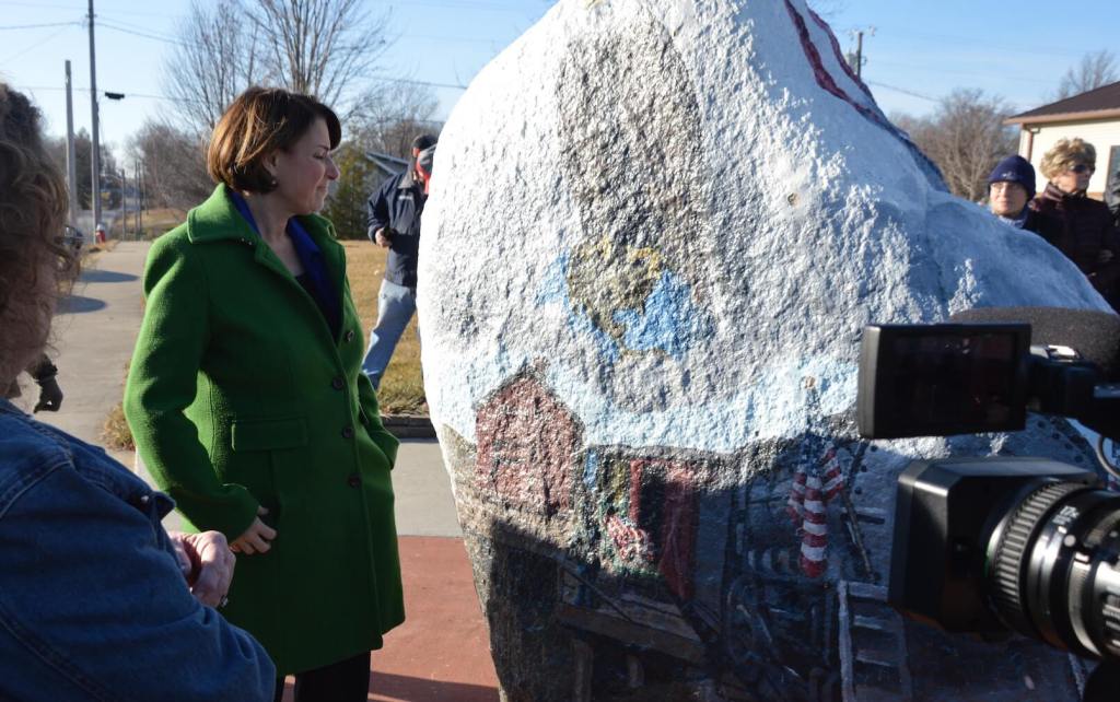 Reception: This was a quick stop to see the local Freedom Rock, a staple of small towns in Iowa (they’re large painted rocks usually dedicated to veterans). Klobuchar also got a history lesson on the tiny Southern Iowa town — it’s the only place in the state where the train tracks run diagonally, hence the name. There were a few caucus tourists there from the Kansas City area.