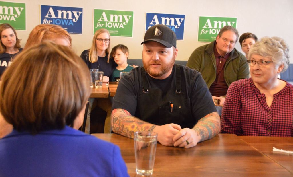 Moment: Klobuchar sat down at the table and talked to the restaurant’s owners about how the farm-to-table restaurant opened, and the local spots where the owners source their food. Klobuchar brought up her line that, “Food doesn’t magically appear on the table.” She connected her work on the Senate Agriculture Committee to the work these restaurant owners do.