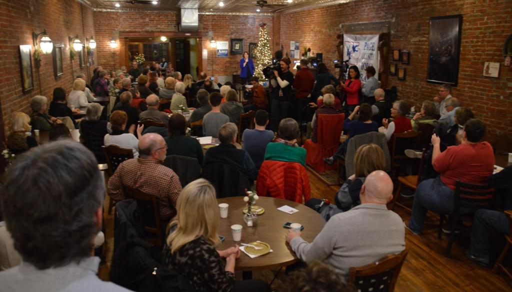 Moment: Andy McGuire entered the room a half hour before Klobuchar and immediately got caught up in and led the crowd in a rendition of God Bless America. Attendees then quizzed McGuire, Klobuchar’s Iowa campaign chair, on things like what the Senator’s hobbies were (she wasn’t sure on that topic, but was well-versed on others). Several of the attendees talked about who former Rep. Leonard Boswell, a native of Lamoni and who passed away last year, might have liked.
