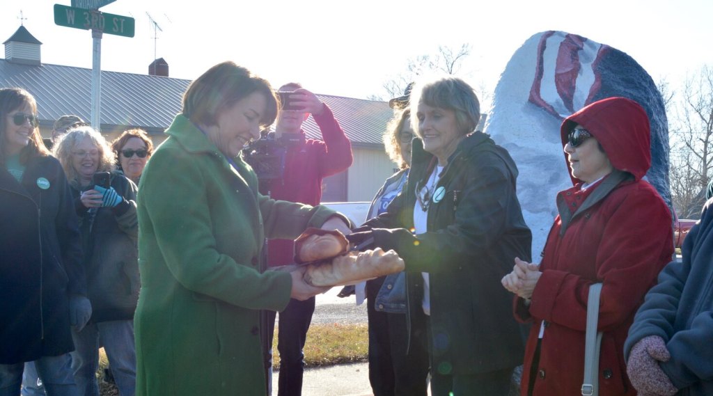 Moment: Klobuchar was presented with a gift of two loaves of freshly-baked bread by local Democratic activists. One of the women who met her was a retired librarian, and Klobuchar discussed her favorite books growing up: Little House on the Prairie and Stuart Little.