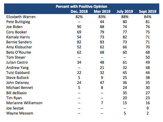 Warren has the strongest positive opinion ratings of the field at 84%, followed by Buttigieg at 81%.