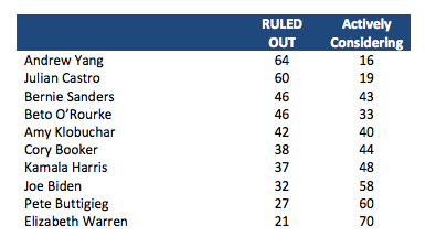 The poll also asked who likely Iowa caucus-goers were actively considering to support, which can be a useful measure in a field this massive. In this question, the news isn’t as good for Yang, with only 16% currently considering him. Castro has also been ruled out by a surprisingly large number of people.