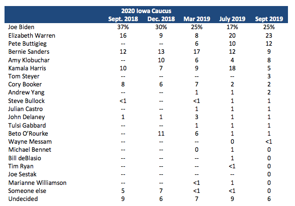 It’s a bit of a bounce-back for Biden, who regains his lead in September, and a big drop-off for Harris, who falls a full 13 points since July, when she was riding high off of her first debate performance. Pete Buttigieg still leads the second cluster of contenders behind the two front-runners.