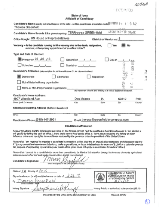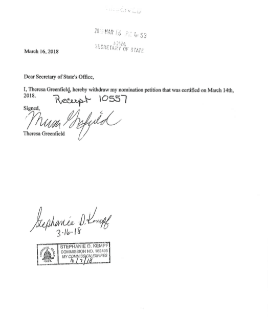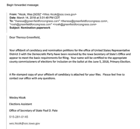 Greenfield had hoped for the Attorney General’s office to weigh in officially on the matter so they would know if her situation would certainly apply to this code. But Tom Miller declined to do so, as did Secretary of State Paul Pate. Greenfield’s campaign initially held up some wording from Pate that the office would “receive” her affidavit of candidacy and the Democratic committee’s certification, but Pate’s office pushed back to clarify that.