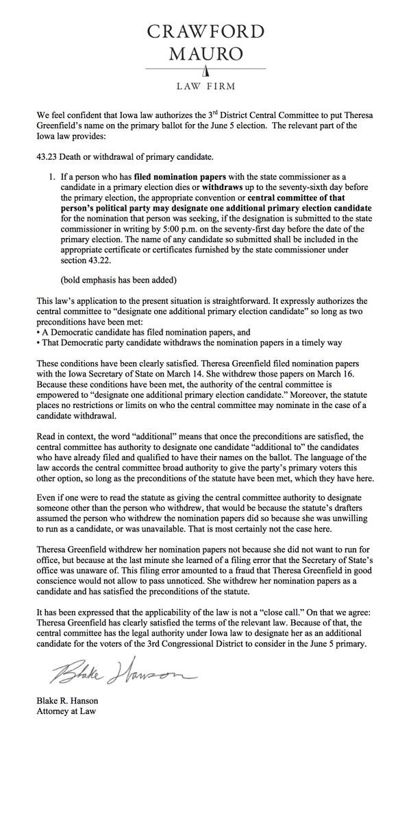 The legal rationale that the Greenfield campaign is pursuing in this case has to deal with an obscure part of the Iowa Code, section 43.23. That section (posted in full at the end of this article) lays out how a party “may designate one additional primary election candidate for the nomination that person was seeking” in the case of the death or withdrawal of a candidate in a primary a certain number of days before the election takes place.