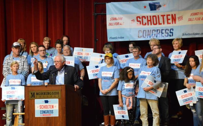 Bernie Sanders got the band back together at his rally in Sioux City for Steve King opponent J.D. Scholten yesterday evening. A crowd of 500 people, many of whom caucused for Sanders three years ago, packed an auditorium at Morningside College to hear the senator’s familiar lines about economic inequality and universal healthcare.