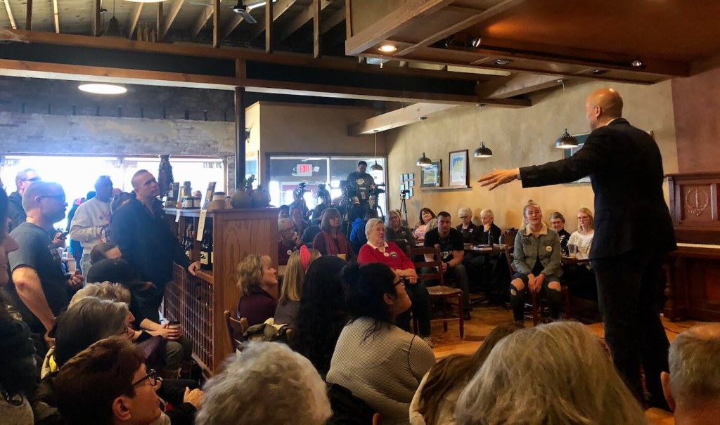 At Deja Brew in Spencer, Booker said that while drafting his legislation on rural policy, he had before visited Iowa to meet with the experts: farmers. Some of those farmers were Republican, so to win them over, he told them, “Your cows are utterly amazing, sir.” The candidate said he was really “milking his jokes.”