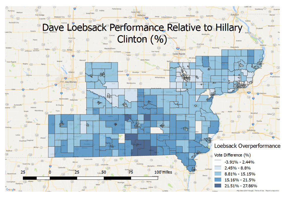 Interestingly, Loebsack performed worse than Hillary did in Johnson County, a liberal stronghold and home to his opponent, Dr. Chris Peters. Loebsack’s underperformance in Johnson County may largely be attributable to the fact that Johnson didn’t experience the same Obama/Trump flip that the rest of the counties experienced. Similarly, Loebsack didn’t perform exceptionally well in Scott county, outperforming Hillary by only 5 points.