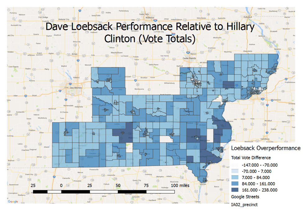 Loebsack performed so well, he averaged an 11-point difference in votes than Hillary did, winning his district handily by approximately 7 points. What drove the split-ticket voting that resulted in Dave’s win? According to the data, Dave overperformed in rural, small-town communities. In Davis County, a small county with a population of just under 9,000, Loebsack outperformed Hillary by a staggering 41 points. He saw similar margins over Clinton in Monroe (36%) and Van Buren (31%) Counties as well.
