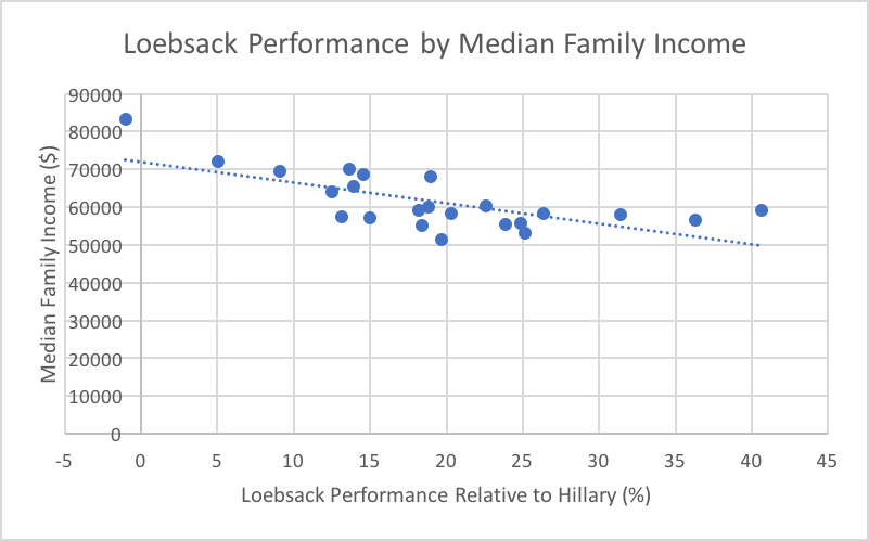 Using multiple linear regression, I developed a model to control for variables (specifically, unemployment, age, ethnicity, education, incomes and employment in manufacturing) that would determine who split ticket voted by county. The strongest and only statistically significant variable in my analysis determined that the voters who split their ticket Trump/Loebsack had lower household incomes than those who voted down the line. From my model, counties observed a .93% decreased in Loebsack’s overperformance for every additional $1,000 in median family income.