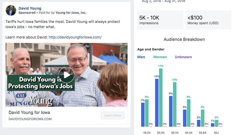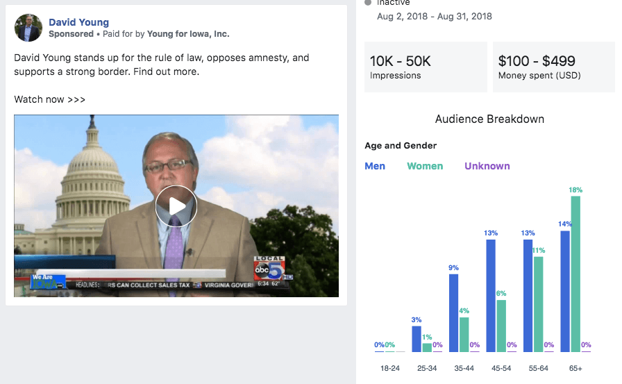 In that race, the national Democratic committee began running a series of Facebook ads three weeks ago to attack Congressman David Young in Iowa’s 3rd District. Their first two spots hit David Young over an “Age Tax” and potential cuts to Medicare and Social Security, but two runs of those ads were targeted specifically to voters under 55. In these two instances, the DCCC paid $1,000 to $5,000 to run ads with messaging for older Iowans that completely excluded older Iowans.