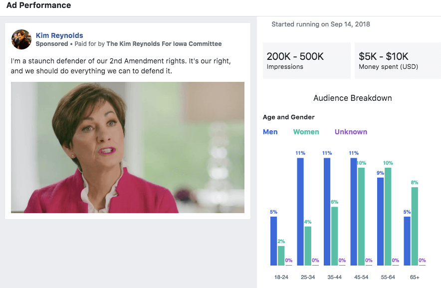 The stats that Facebook’s Ad Archives give are a little vague but still helpful. They give a range of money spent, impressions earned, age and gender targeting, as well as which states they were targeted to (I’m only including that when relevant; most are to Iowa only). This first one gives you a sense of just how cost effective Facebook ads are. For less than $10,000, Hubbell got his ad seen between 500,000 to a million times (Iowa’s total turnout in 2014 was 1.1 million voters). Meanwhile, Hubbell spent $42,000 on TV ads on KCCI in one week alone earlier this month.