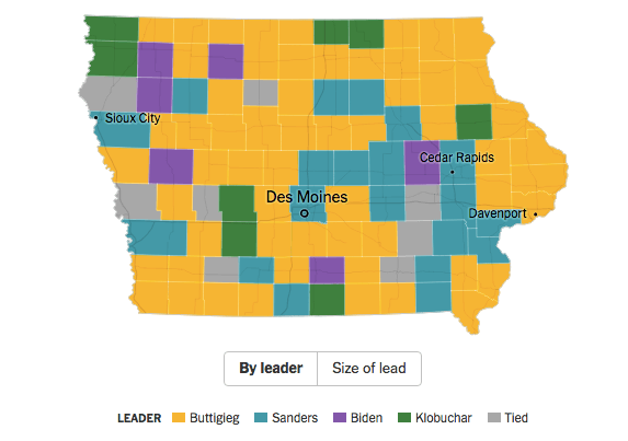 Right now, the county map could still change based off precincts outstanding. But currently, we can see Buttigieg carrying much of rural Iowa, while Sanders is doing well in many of the urban centers around Sioux City, Council Bluffs, Des Moines, Cedar Rapids and Iowa City. Klobuchar will pick off several rural counties, including some in Northern Iowa, while Warren isn’t leading in a single one yet.