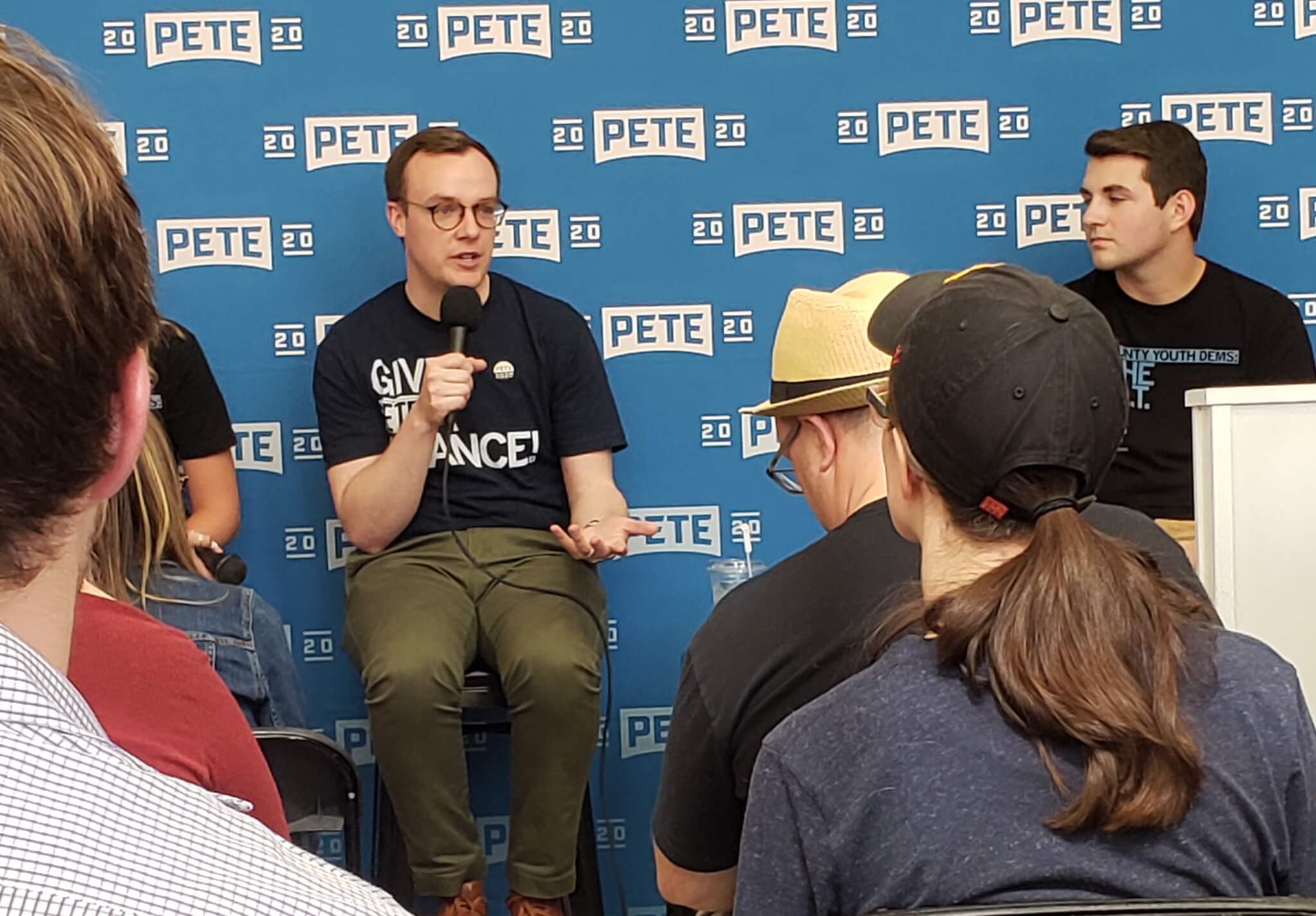 Chasten Buttigieg stopped at Raygun Friday afternoon, where he then addressed a group of 30 to 40 people in the Mars Cafe coffee shop, answering questions from two moderators. The questions touched on a variety of topics, but a broad theme was how his life has been changed by becoming more politically engaged – first by marrying a mayor and then by campaigning across the country.