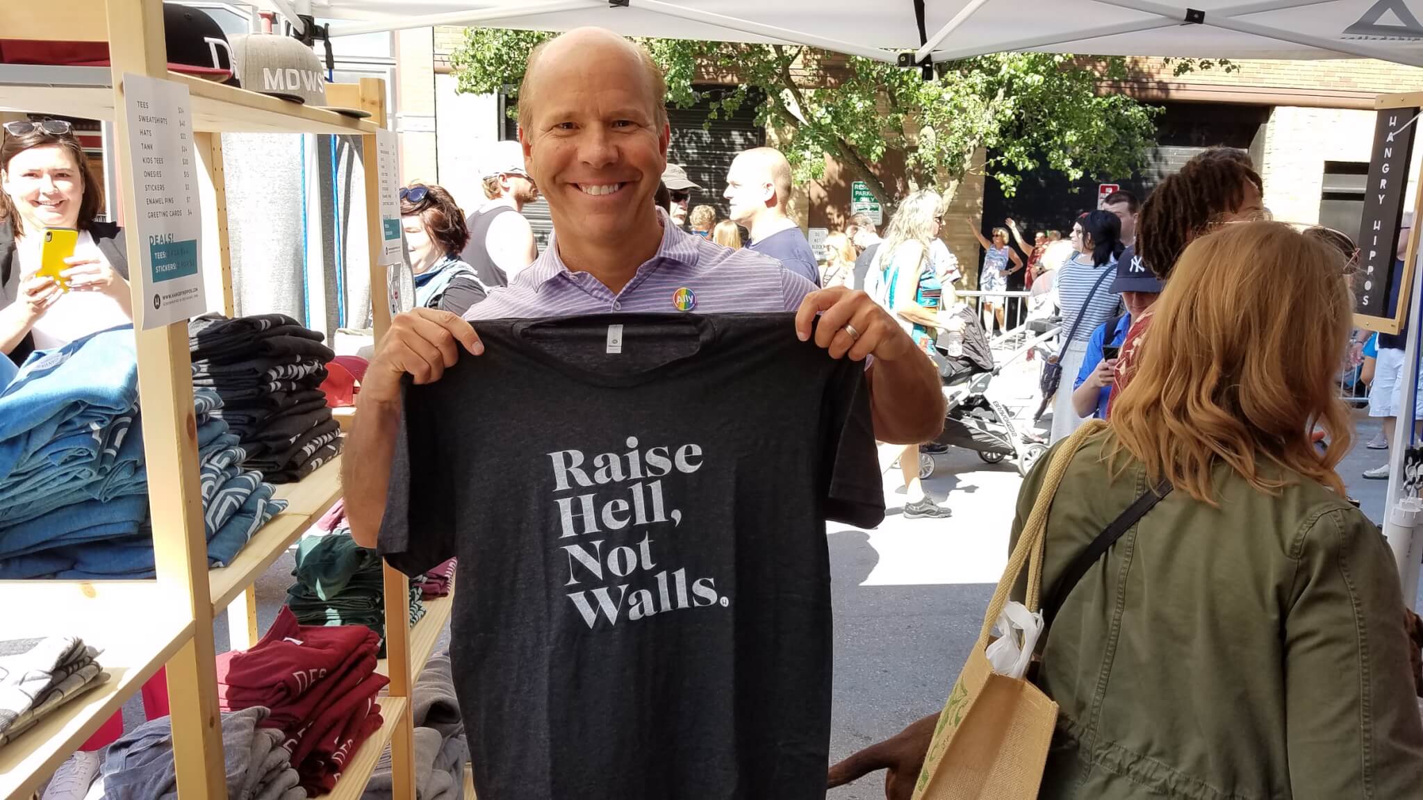 In downtown Des Moines, John Delaney visited the Des Moines’ Farmer’s Market. He only made it a few feet down Fourth Street before he spotted the Hangry Hippos stand, where he bought a few “Raise Hell, Not Walls.” shirts.
