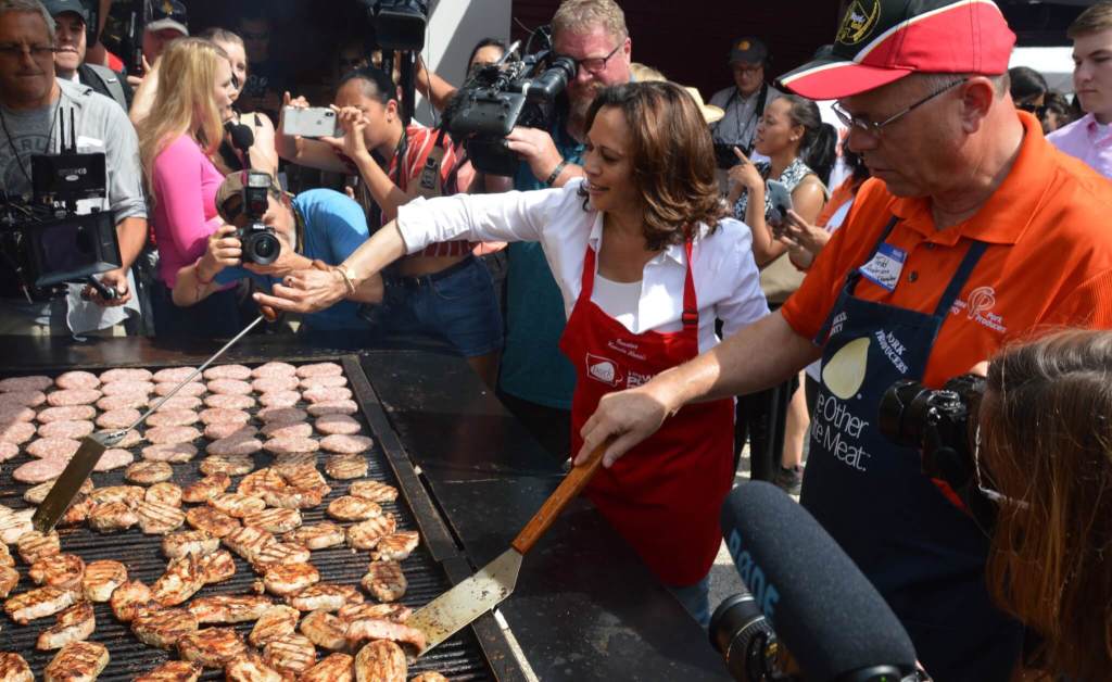 And Harris took her turn at the Pork Producers tent to flip some chicken and burgers.