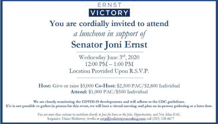 Two items on a fundraiser invitation from Sen. Joni Ernst’s campaign drew the attention of national politics watchers this week: “location provided upon RSVP” and the name of a consulting firm at the bottom of the invite. “Wait … fundraisers are back?” Politico opined in its Playbook PM newsletter, which included a copy of the invitation.…