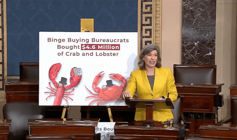 “Let me tell you folks, Iowans and hardworking folks across the country really should be appalled by many of the last minute purchases our tax dollars are paying for,” Ernst said. “And I’ll just give you some examples. Right here, $4.6 million were spent on lobster tail and crab. $2.1 million dollars spent on games, toys and wheeled goods, over $53,000 on china and tableware, more than $40,000 on clocks.”