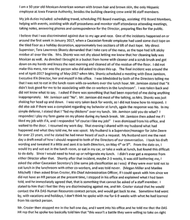 Her public complaint with the Iowa Civil Rights Commission accuses Dave Jamison and her own direct boss of firing her with no explanation. She believes it was due to her being the only Hispanic person at IFA (you can view photos of about two-thirds of IFA’s staff on their website – they do all at least appear to be caucasian).