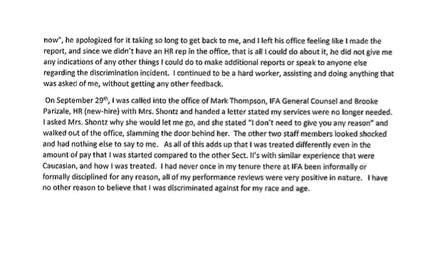“I had never once in my tenure there at IFA been informally or formally disciplined for any reason, all of my performance reviews were very positive in nature,” she wrote in her official complaint. “I have no other reason to believe that I was discriminated against for my race and age.”