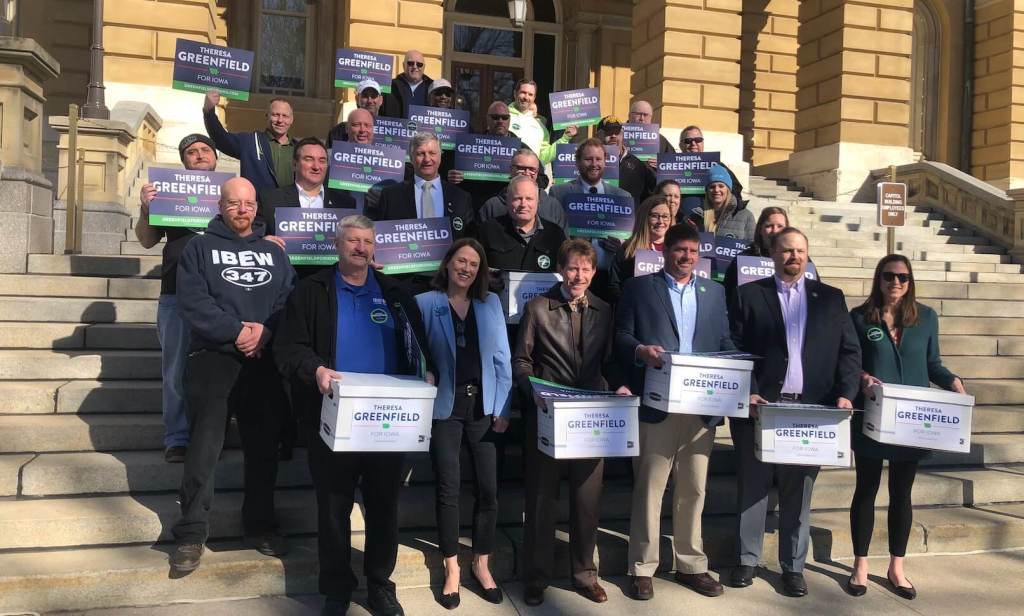 Theresa Greenfield marched up to the Iowa Statehouse this morning, flanked by dozens of labor union members carrying boxes that contained over 20,000 signatures to put her on the ballot for the June primary. It was the most names of any of her Democratic competitors who also hope to take on Sen. Joni Ernst for the Senate seat this fall.