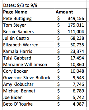 For Facebook ads, we’re taking a look through the Facebook political ad archive library. When selecting the last seven days, it gives us September 3rd to 9th, which isn’t perfectly “last week,” but it’s close enough. This is for the entire country, not just Iowa. Here’s what everyone is spending in just one week: