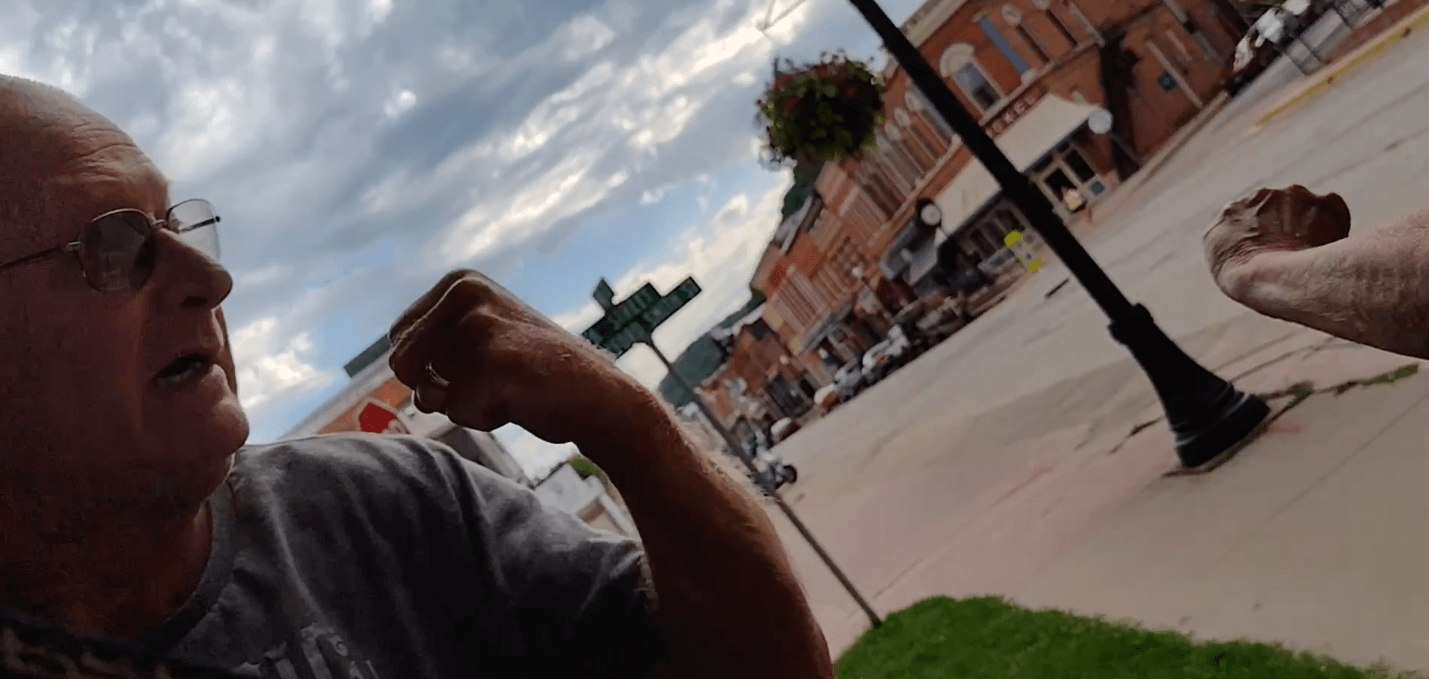 “You come in my little town with your stupid fucking signs,” Paradine yells at the 35-second mark.