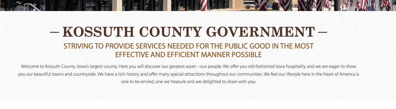 At 974 square miles, Kossuth is Iowa’s largest county in terms of total land area and sticks out on any state map because of its length. North to south, Kossuth is about 41 miles long whereas O’Brien County, for example, is 24 miles north to south.