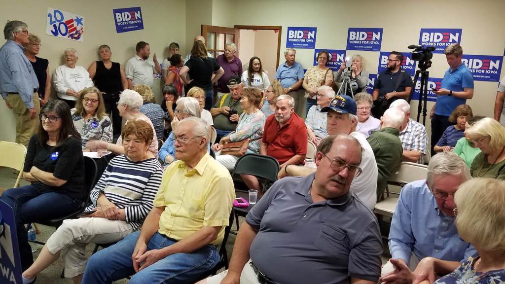 About 75 people turned out for the Des Moines office event, with another 50 up in Mason City on Friday. The crowds at both skewed older, as do most of Biden’s public events while campaigning in Iowa.