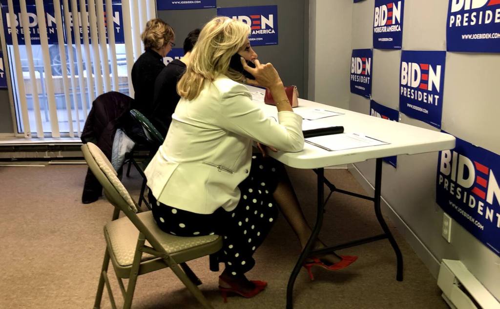 “You know, Wally, I know you’re signed up to be on our team, but we want you to be a precinct captain,” Dr. Biden said, as two other volunteers worked the phones beside her.