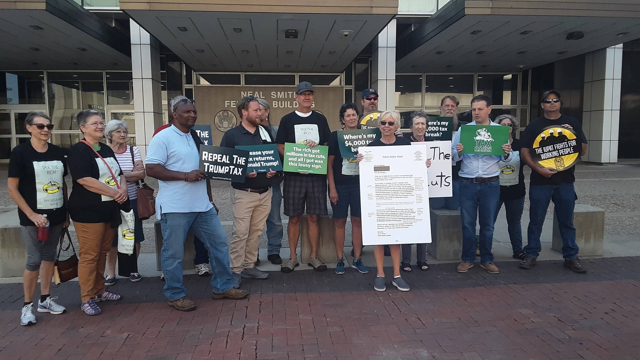 Tax March Iowa and its supporters protested Senator Joni Ernst and the 2017 Tax Cuts and Jobs Act in front of the Neal Smith Federal Building in Des Moines at noon Thursday.