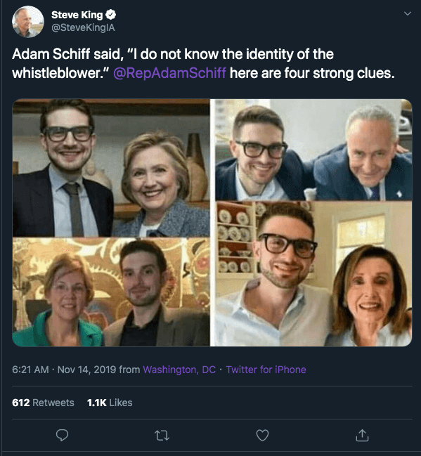 King wrote: “Adam Schiff said, ‘I do not know the identity of the whistleblower.’ @RepAdamSchiff here are four strong clues.”