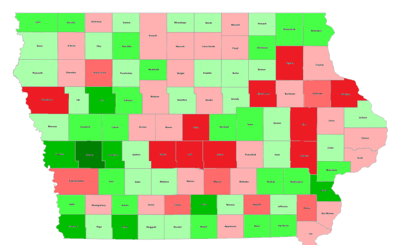 Compare it to the county results map from the 2012 election results. It doesn’t track perfectly, but you can see an overall trend of Grassley sticking to mostly-Republican areas of the state: