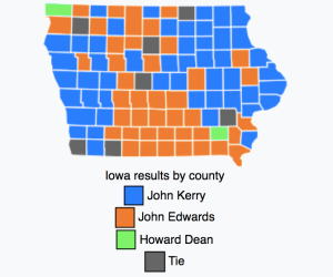 In 2004, left-wing candidate Dennis Kucinich came in second place in Jefferson County with 29% of the vote. Statewide, only 1% of Democratic caucus-goers supported the former Ohio congressman. Howard Dean ended up carrying the county, one of just two Iowa counties that he won.