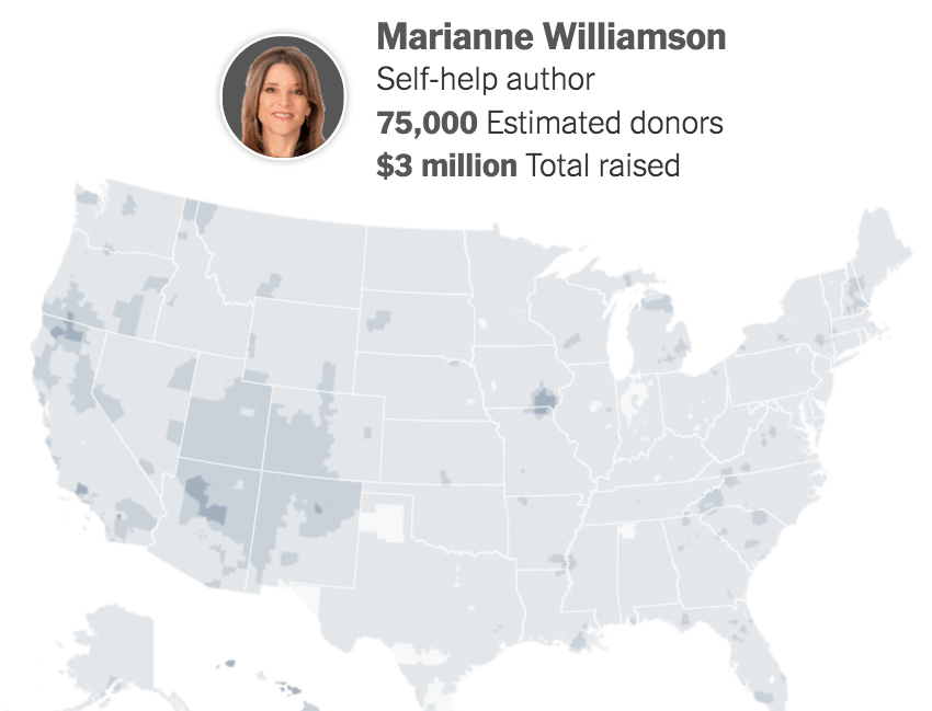 A New York Times graphic of financial support for presidential candidates showed some of the highest concentration of donations in the country for Gabbard and Williamson came from in and around Fairfield.