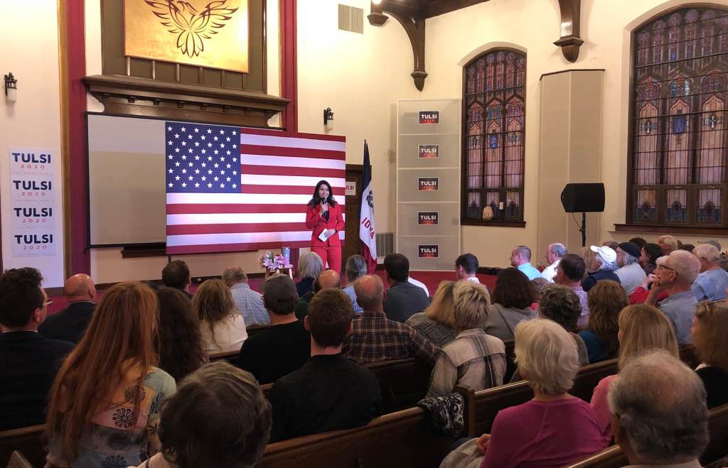 More than 100 people filled the pews and stood in the back of the hall to see Gabbard, polling at 2% in Iowa.
