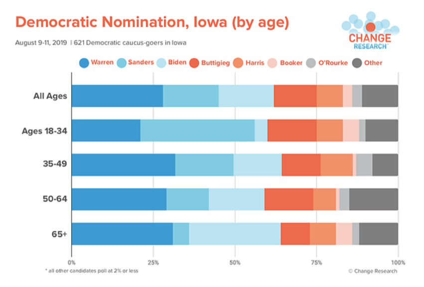 The other good news for Warren is that her support appears to be very broad in the party. She leads every age demographic (even surpassing Biden in the oldest age bracket, 31% to 28%) except for the youngest. Sanders has a 14-point lead here among the 18-34 range with 34%.