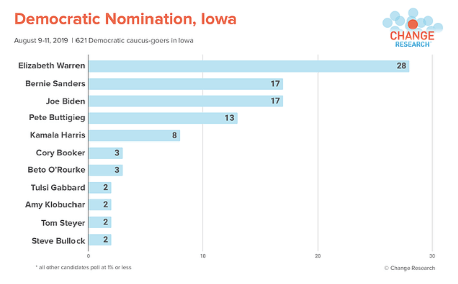 A new Iowa Starting Line-Change Research poll shows the senator opening up a commanding lead in the Iowa Caucus. Warren was the top pick of 28% of likely Iowa Caucus-goers in the poll, an 11-point lead over the nearest competitor. Joe Biden and Bernie Sanders were both tied for second with 17% each. Pete Buttigieg came in fourth at 13% and Kamala Harris has the backing of 8%.