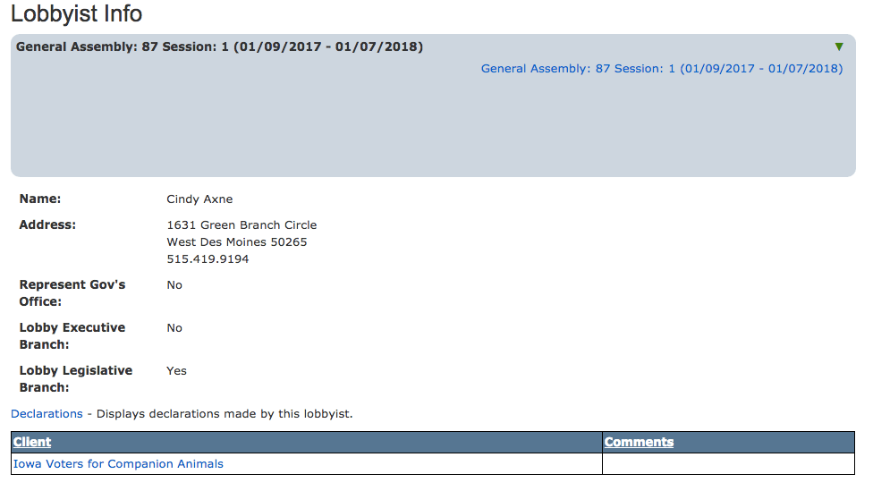 If you look online at Iowa’s lobbying database, Axne does come up in it. Once. For the Companion Animals organization. That’s it. She’s not in there for any other year or cause.