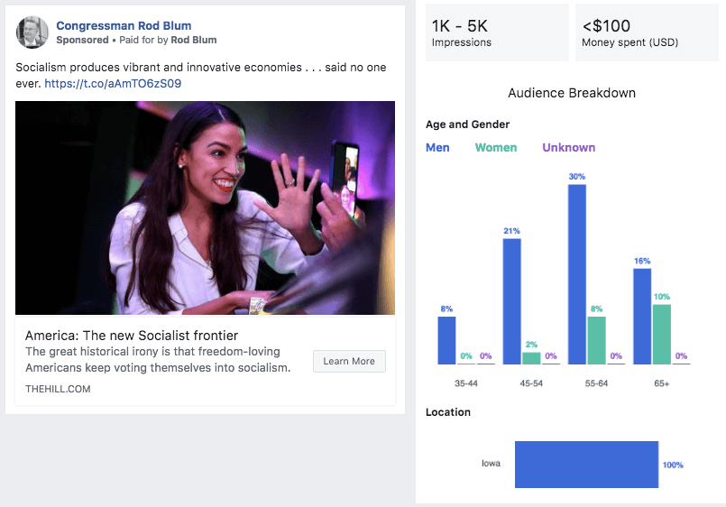 The ad buys are relatively small, less than $100 and reaching somewhere between 1,000 and 5,000 people each. In January, Blum boosted a post he made that was critical of socialism, and one that touted economic numbers under Donald Trump, which also had a picture of him and Trump.