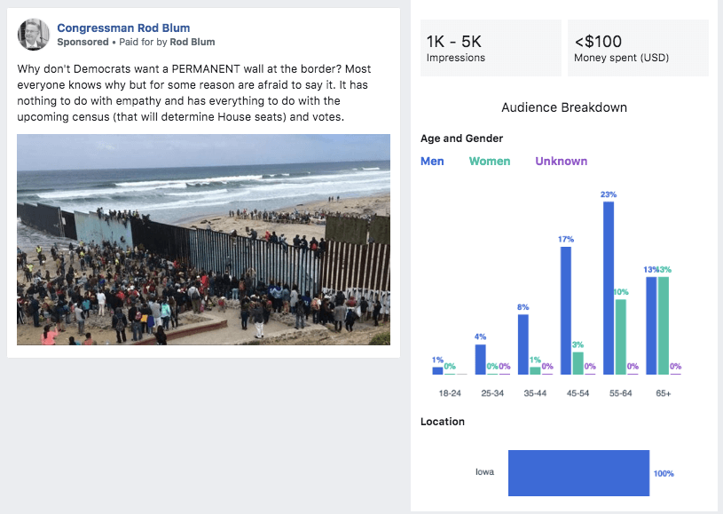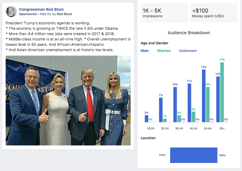 A quick review of the Facebook Ad Archive shows Blum continuing to pay for Facebook ads over the past two months. The “paid for” line simply lists “Rod Blum,” as opposed to the “Blum For Congress” disclaimer used back during the election. These ads also come from his former official Facebook page, Congressman Rod Blum, and not his old political account.
